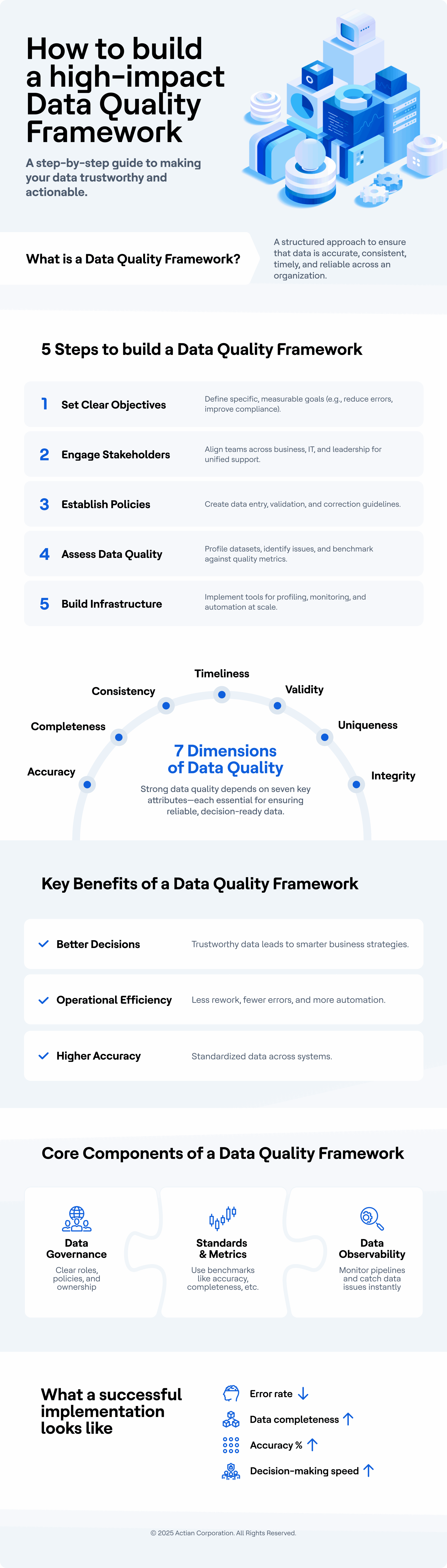 A data quality framework provides a structured approach to ensure that data is accurate, consistent, timely, and reliable. This comprehensive framework serves as a blueprint for managing data quality across an enterprise, outlining the tools, processes, and standards necessary to maintain and improve data over time.